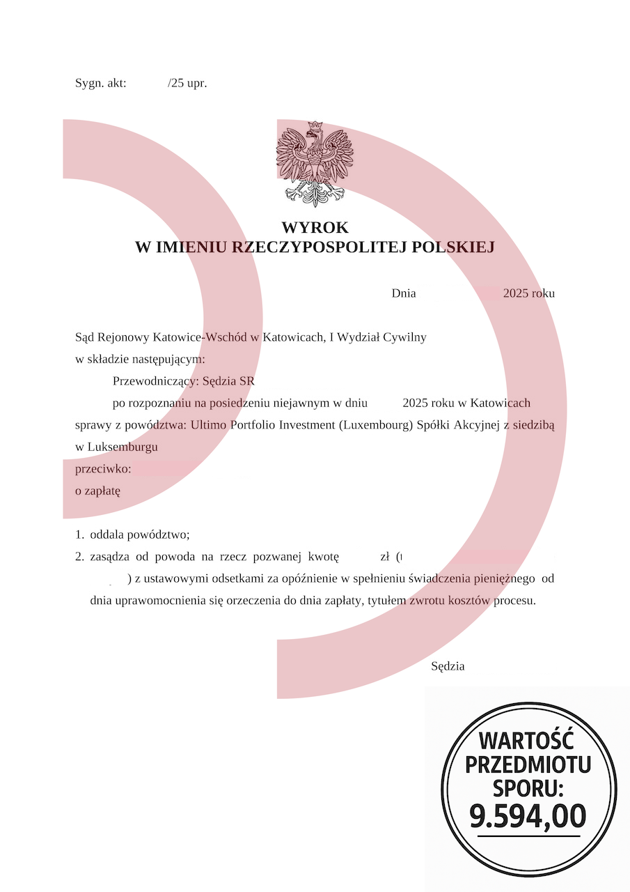 W przypadku załączonego wyroku pomoc prawnika doprowadziła do jednoznacznego oddalenia powództwa w sprawie o wartości przedmiotu sporu 9.594,00 zł. To dowód, że zamiast płacić lub wpadać w panikę, warto działać mądrze i świadomie.