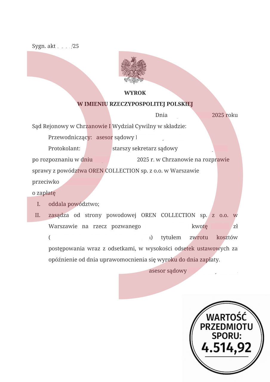Uzyskany efekt: Powództwo oddalone w całości, brak odsetek, brak kosztów procesu