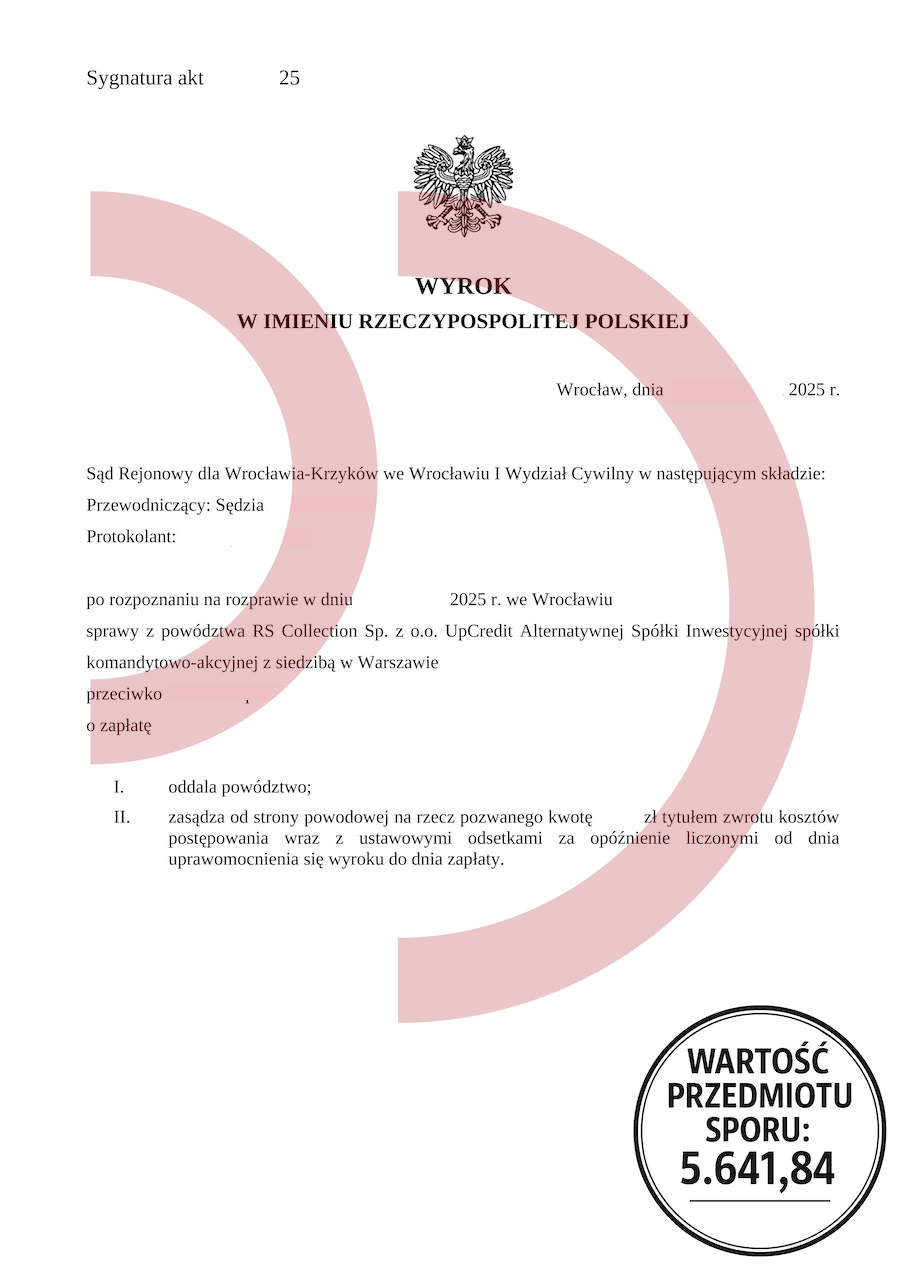 Uzyskany efekt: Powództwo oddalone w całości, brak odsetek, brak kosztów procesu