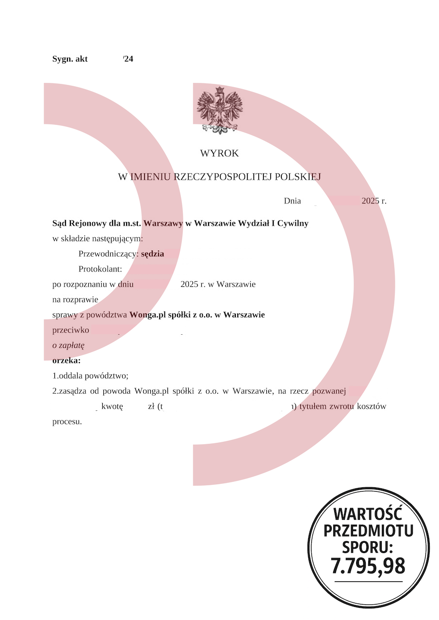 Uzyskany efekt: Powództwo oddalone w całości, brak odsetek, brak kosztów procesu