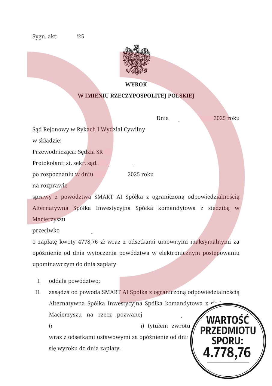 Smart AI to firma, która często kupuje długi wątpliwej jakości, a następnie szybko kieruje sprawy do sądu. Co ważne, nawet jeśli dłużnik podpisze ugodę, to Smart AI i tak potrafi złożyć pozew, wykorzystując sytuację przeciwko niemu. Właśnie w takim momencie skuteczny adwokat w Łodzi wygrywa, bo zna sztuczki tego wierzyciela i jego standardowe błędy. Często to wystarcza, aby podważyć roszczenie już na pierwszym etapie postępowania.