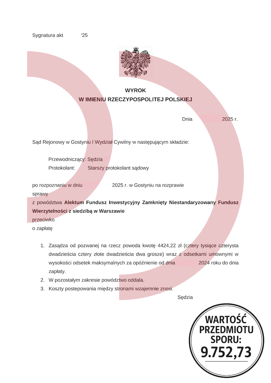 Ogromne znaczenie ma również stanowisko sądów, które coraz częściej oceniają roszczenia funduszy sekurytyzacyjnych i firm pożyczkowych wyjątkowo skrupulatnie. Przykładem jest załączony wyrok przeciwko Alektum, w którym sąd obniżył żądanie z 9.752,73 zł do 4.424,22 zł, a pozostałą część powództwa oddalił, co pokazuje, jak wiele roszczeń jest zawyżonych i nieudowodnionych. Takie rozstrzygnięcia doskonale obrazują, że skuteczne umorzenie postępowania windykacyjnego jest możliwe nie dzięki szczęściu, ale dzięki właściwej taktyce prawnej.