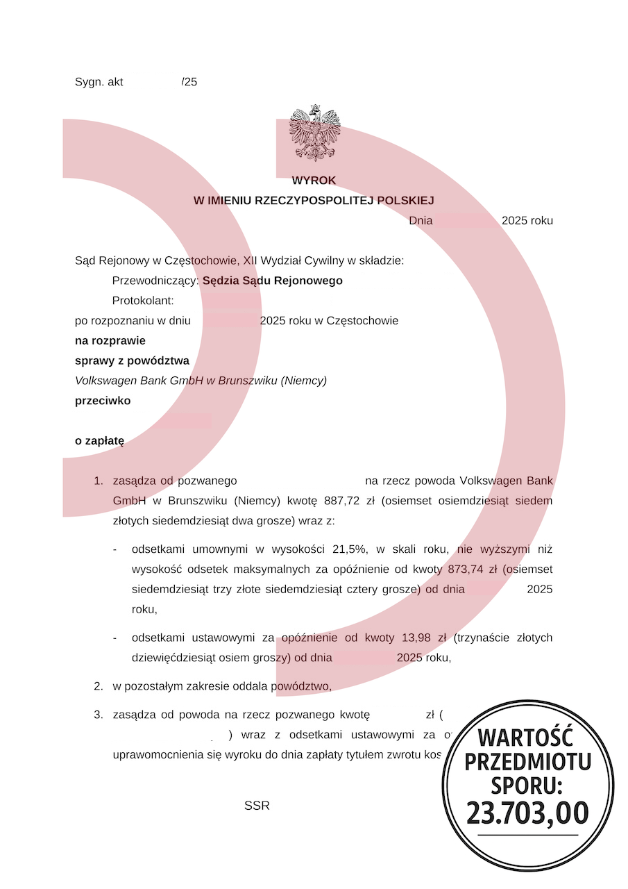 Doskonale ilustruje to załączony wyrok w sprawie Volkswagen Bank GmbH przeciwko konsumentowi. Wartość przedmiotu sporu wynosiła 23.703,00 zł, a sąd oddalił znaczną część żądań powoda, zasądzając na rzecz pozwanego zwrot kosztów procesu. Ostatecznie Volkswagen Bank uzyskał jedynie niewielką część roszczenia – 887,72 zł, a pozostała część została oddalona. Taki wynik sprawy pokazuje, jak wiele można osiągnąć, gdy po stronie konsumenta działa dobry prawnik od długów w Łodzi, który potrafi wskazać błędy, braki dowodowe oraz nienależyte naliczenia kosztów.