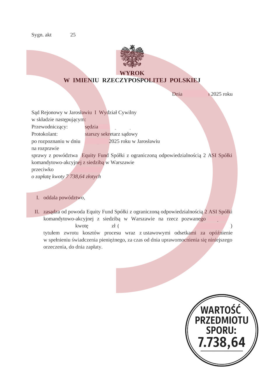 Coraz więcej spraw przeciwko konsumentom kończy się korzystnie, gdy sprawą zajmują się specjaliści. Załączony wyrok z Sądu Rejonowego w Jarosławiu jest tego najlepszym przykładem. Sprawa dotyczyła roszczenia wniesionego przez Equity Fund sp. z o.o. ASI, a wartość przedmiotu sporu wynosiła 7.738,64 zł. Sąd oddalił powództwo w całości oraz zasądził na rzecz pozwanego zwrot kosztów procesu. To potwierdza, że wiele roszczeń firm działających w sektorze pożyczek pozabankowych jest nieudokumentowanych lub wadliwych.