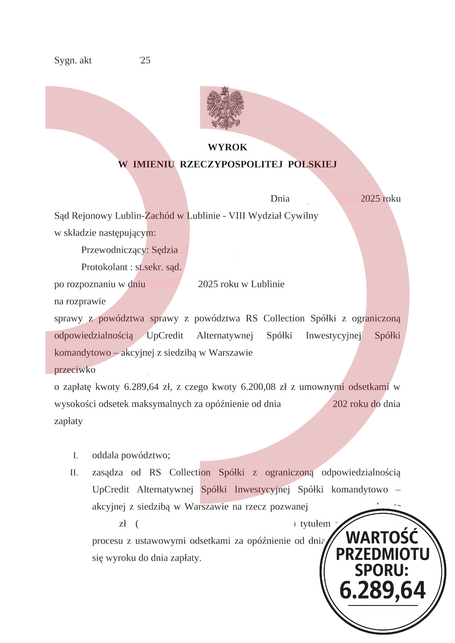 Powód: RS Collection Sp. z o.o. UpCredit Alternatywna Spółka Inwestycyjna Spółka Komandytowo-Akcyjna