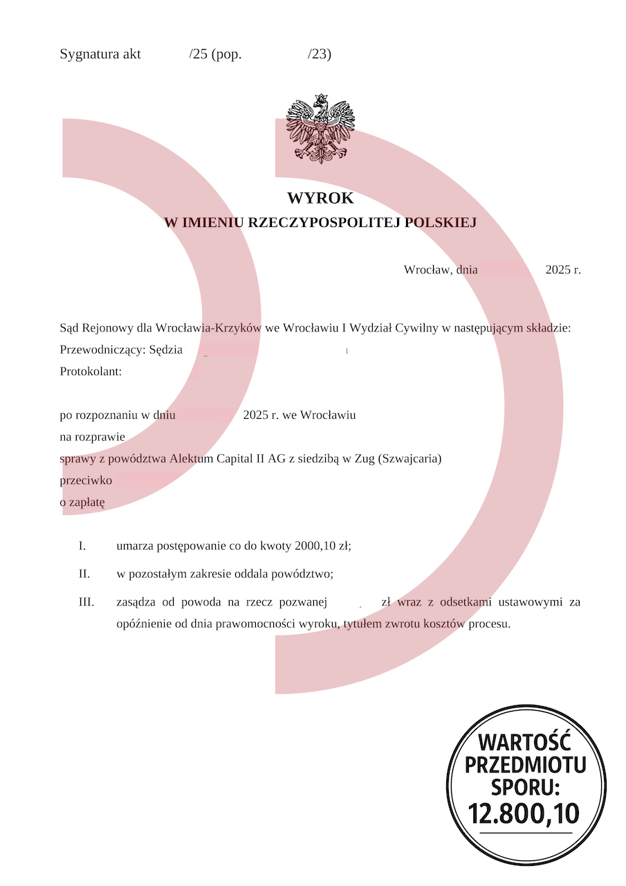 Uzyskany efekt: Powództwo oddalone w całości, brak odsetek, brak kosztów procesu