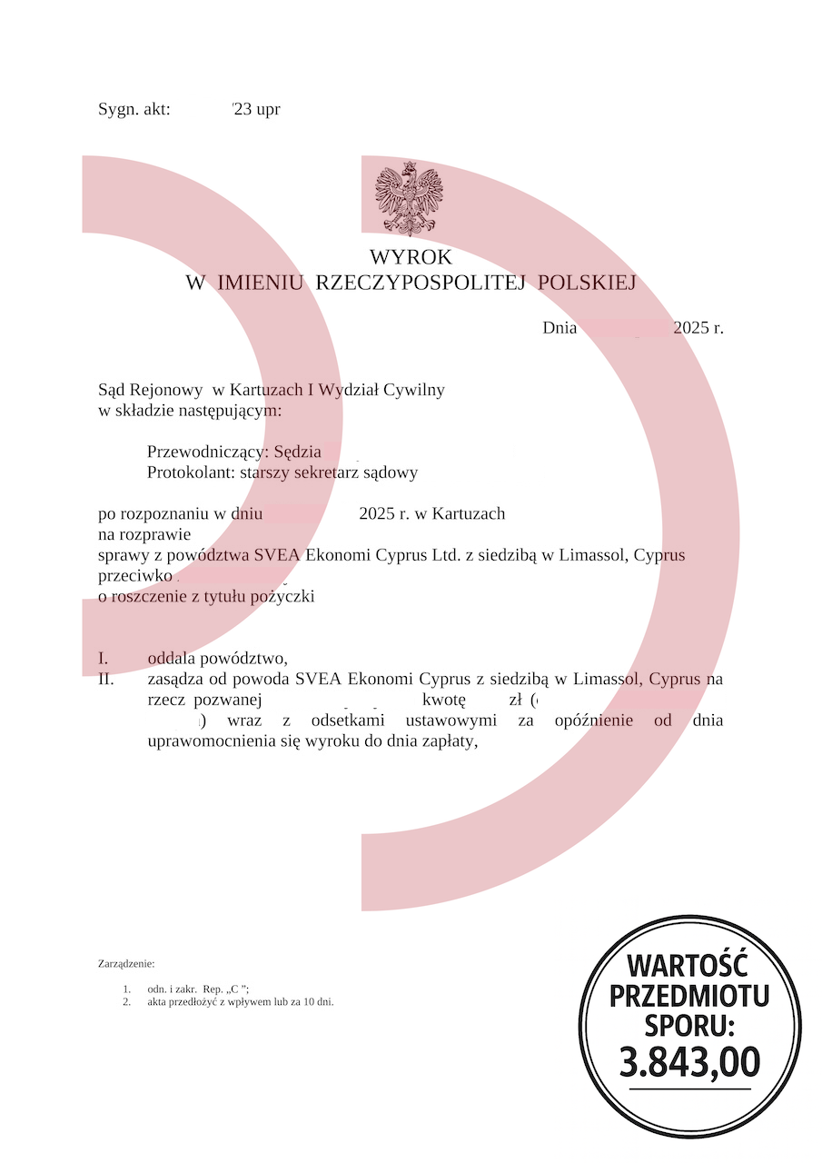 Uzyskany efekt: Powództwo oddalone w całości, brak odsetek, brak kosztów procesu