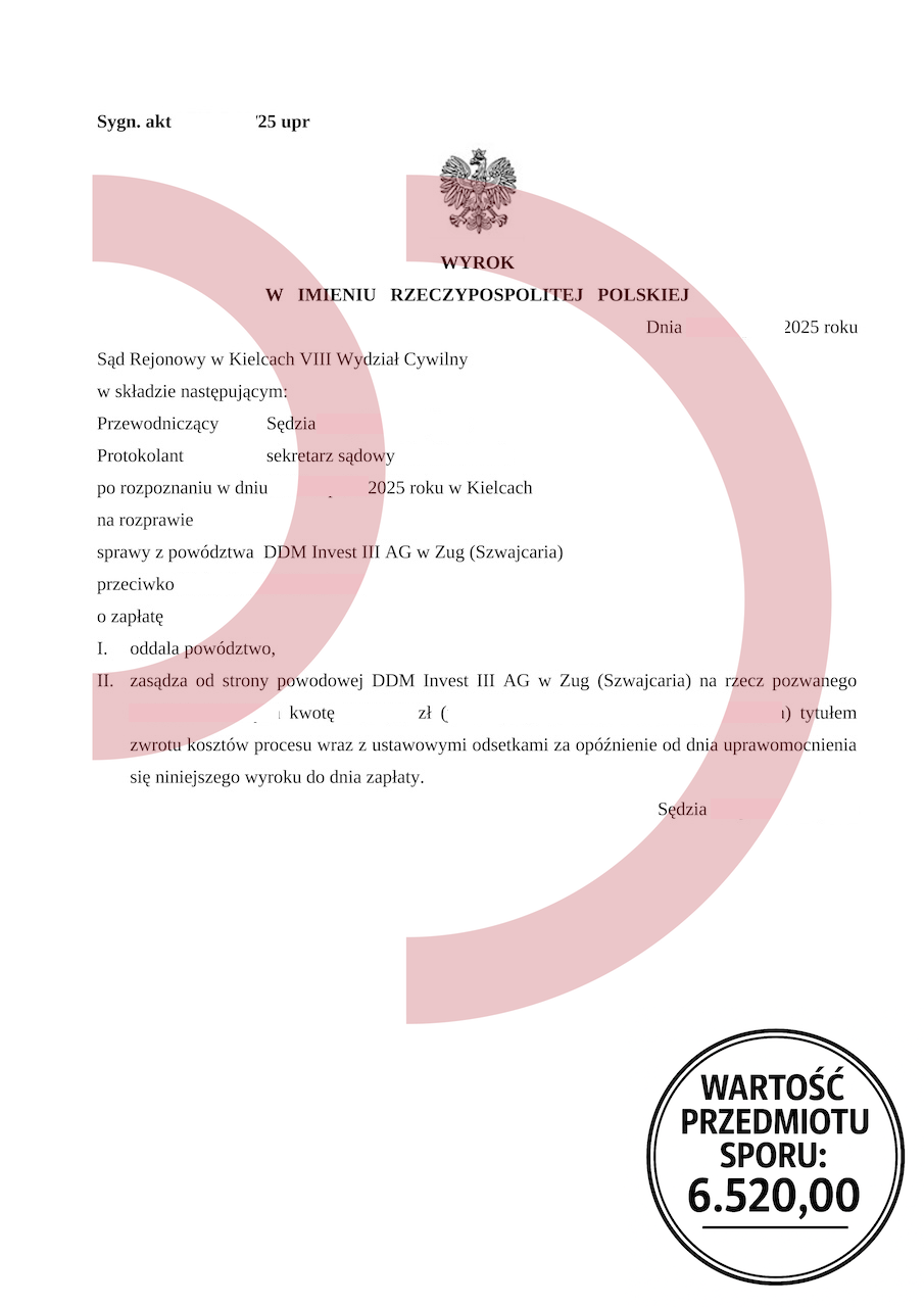 Wielu konsumentów, którzy trafiają do naszej Kancelarii, nie potrafi samodzielnie wyjaśnić co to jest spirala zadłużenia w firmach pozabankowych, choć intuicyjnie czują, że ich sytuacja finansowa wymknęła się spod kontroli. Spirala zadłużenia zaczyna się niewinnie: jedna szybka pożyczka, potem kolejna, a następnie refinansowanie poprzednich zobowiązań tylko po to, aby uniknąć windykacji. Niestety, im bardziej ktoś stara się „ratować” sytuację, tym głębiej zapada się w system opłat, prowizji i rosnących odsetek. Mechanizm ten prowadzi do dramatycznych skutków finansowych i emocjonalnych. Aby przerwać ten cykl, trzeba najpierw dokładnie zrozumieć, co to jest spirala zadłużenia w firmach pozabankowych i jakie kroki pozwalają z niej realnie wyjść. Załączony wyrok z Sądu Rejonowego w Kielcach doskonale pokazuje, że osoby, które wpadły w wieloletnią spiralę pożyczek pozabankowych, mogą skutecznie bronić się w sądzie. W sprawie o 6.520,00 zł sąd oddalił roszczenie DDM Invest III AG w całości i dodatkowo zasądził zwrot kosztów procesu na rzecz pozwanego. To przykład, że walka z niesłusznymi długami naprawdę ma sens.