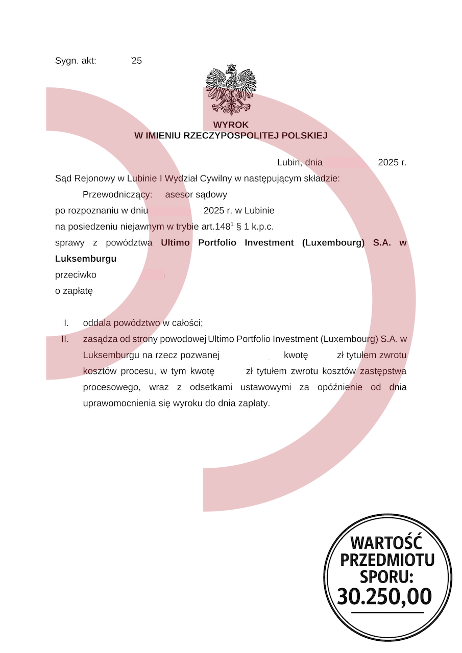 W sytuacji, gdy rachunki rosną szybciej niż możliwości ich regulowania, konsumenci coraz częściej szukają rozwiązań określanych jako niezwykle pilna pożyczka dla zadłużonych. To naturalna reakcja na presję windykacji, wezwania do zapłaty, groźby postępowań sądowych czy obawę przed zajęciem komorniczym. Jednak właśnie wtedy najłatwiej o błąd, który może doprowadzić do spirali zadłużenia znacznie trudniejszej do opanowania, niż wydaje się w pierwszej chwili. Zanim więc ktokolwiek zdecyduje się na niezwykle pilną pożyczkę dla zadłużonych, musi zrozumieć, jakie ryzyka się z nią wiążą i jakie bezpieczniejsze alternatywy ma do dyspozycji. Załączony wyrok z Sądu Rejonowego w Lubinie, w którym oddalono powództwo Ultimo Portfolio Investment (Luxembourg) na kwotę 30.250,00 zł, pokazuje wyraźnie, że nie każde roszczenie wobec zadłużonego konsumenta jest zasadne. Dłużnik, zamiast sięgać po niezwykle pilną pożyczkę dla zadłużonych, zyskał realną ochronę dzięki rzetelnie przeprowadzonej obronie procesowej.