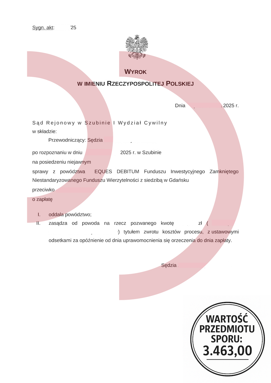 Uzyskany efekt: Powództwo oddalone w całości, brak odsetek, brak kosztów procesu