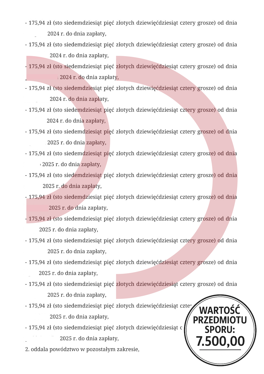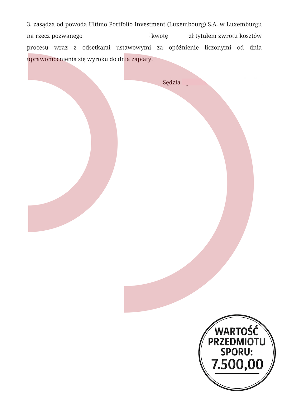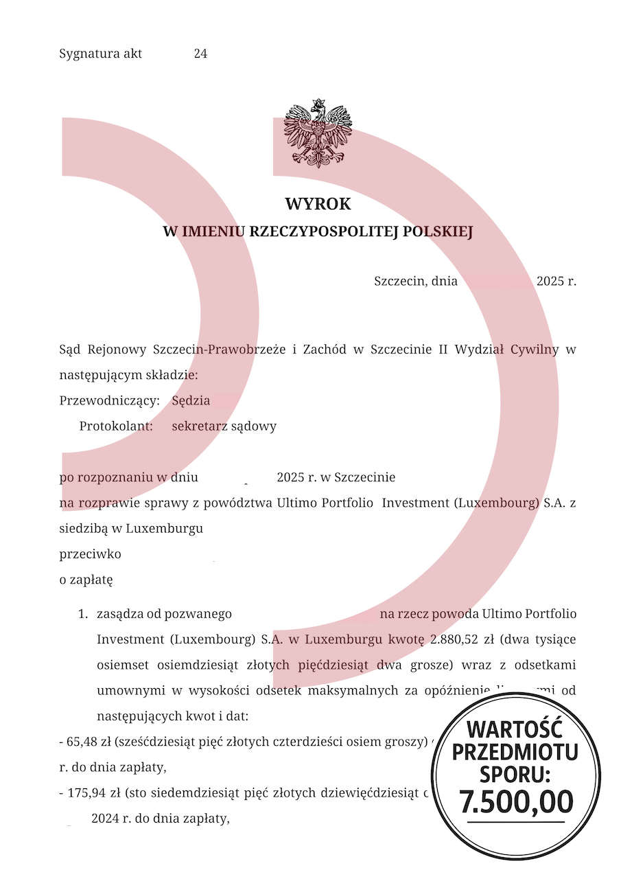 To właśnie dlatego wiele spraw kończy się oddaleniem powództwa – tak jak w załączonym wyroku dotyczącym wartości przedmiotu sporu 7.500,00 zł, w którym sąd częściowo oddalił roszczenia i szczegółowo przeanalizował naliczane opłaty oraz daty wymagalności. Orzeczenie pokazuje, że nawet pozornie trudna sytuacja – wysoka kwota i pozew od funduszu – nie musi oznaczać przegranej.