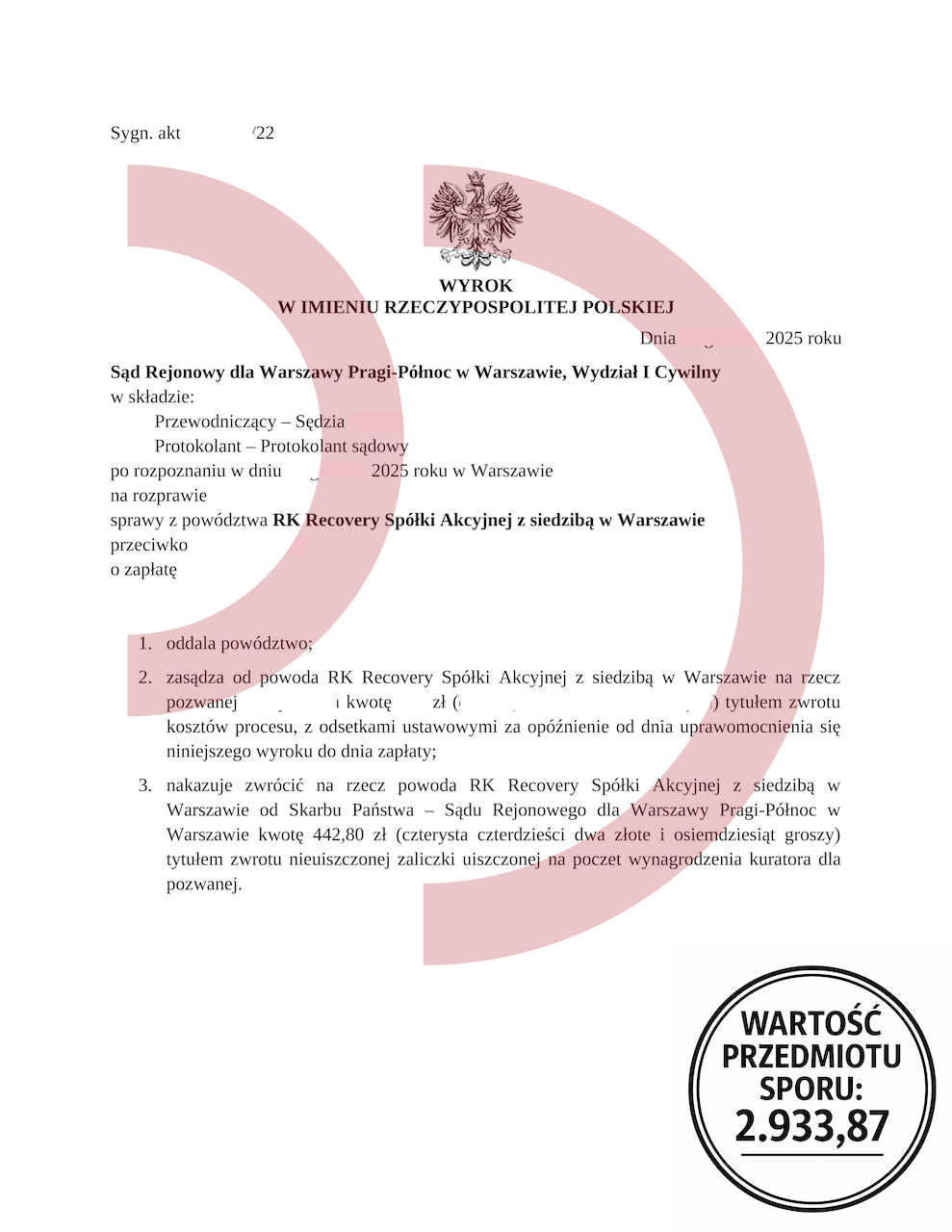 Uzyskany efekt: Powództwo oddalone w całości, brak odsetek, brak kosztów procesu