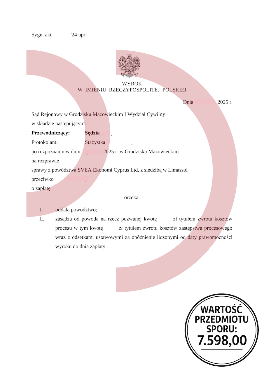 Uzyskany efekt: Powództwo oddalone w całości, brak odsetek, brak kosztów procesu.