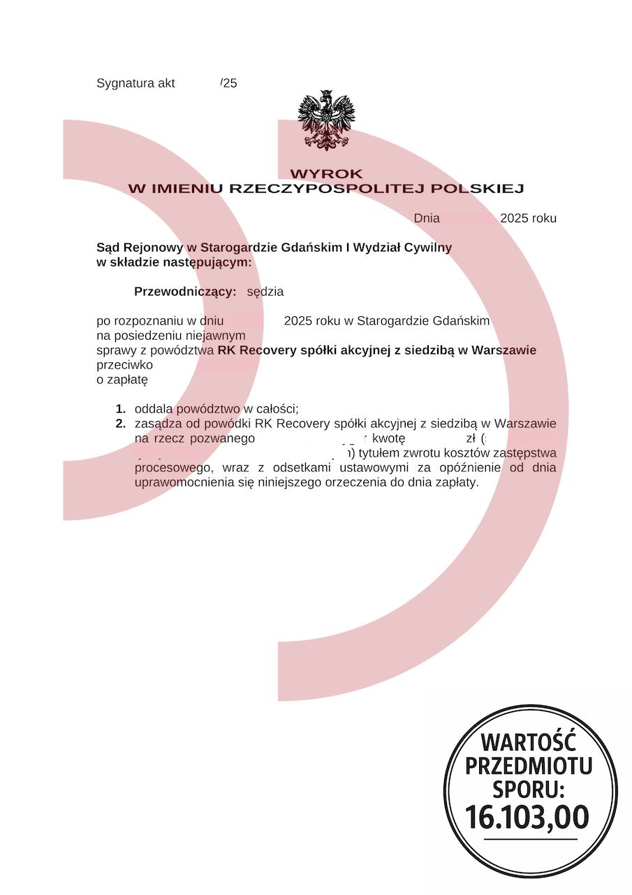 W obecnych realiach finansowych rzetelna pomoc prawna zadłużonym nie jest luksusem – jest koniecznością. To ona chroni konsumentów przed niesłusznymi roszczeniami, przedawnionymi długami, nieuczciwymi kosztami i agresywną windykacją. Załączony wyrok tylko potwierdza, że dobrze poprowadzona sprawa może zakończyć się pełnym sukcesem.