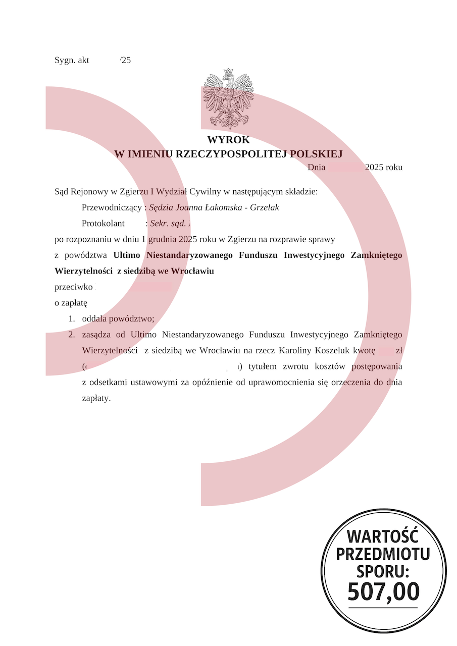 Uzyskany efekt: Powództwo oddalone w całości, brak odsetek, brak kosztów procesu.