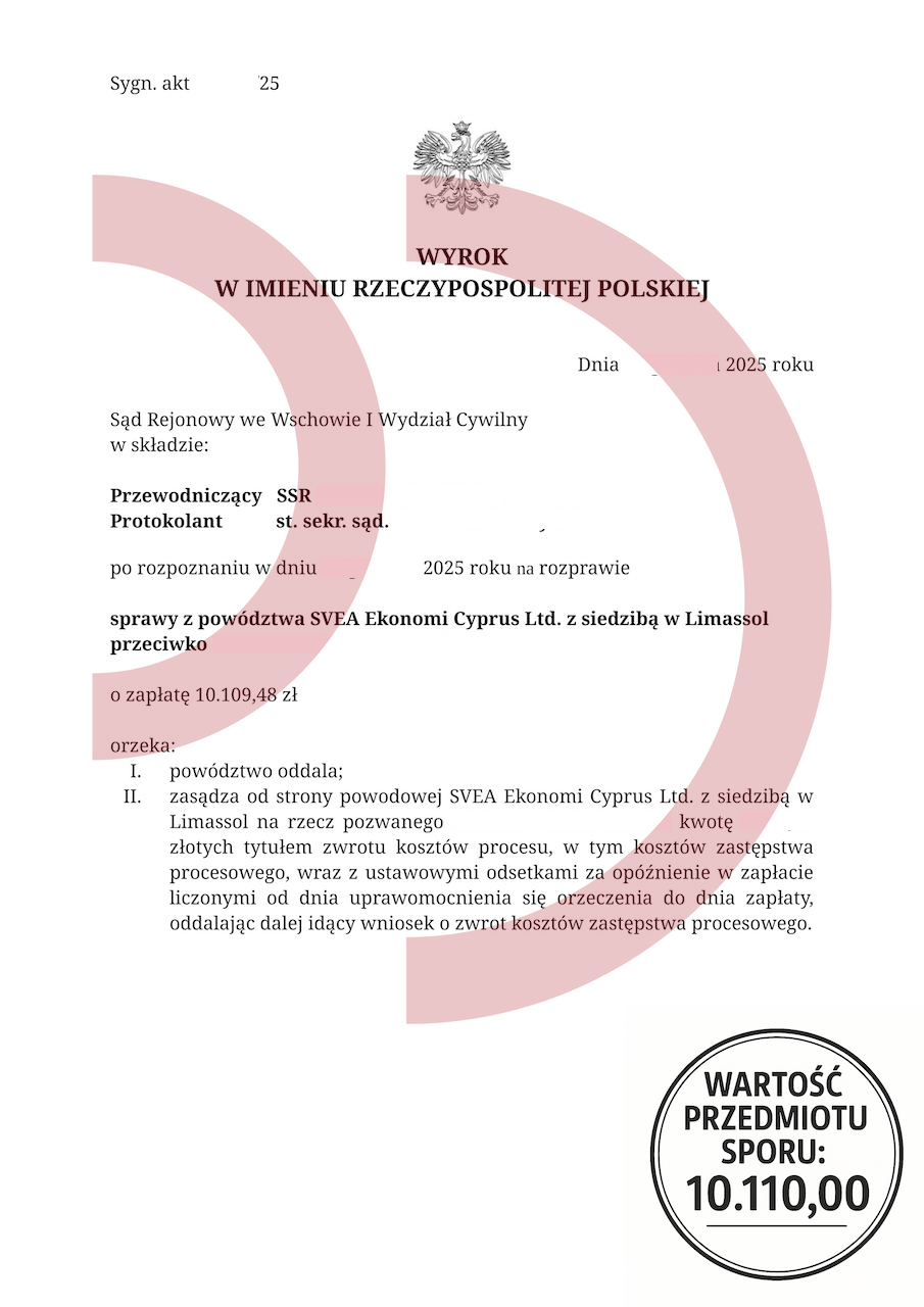 Uzyskany efekt: Powództwo oddalone w całości, brak odsetek, brak kosztów procesu