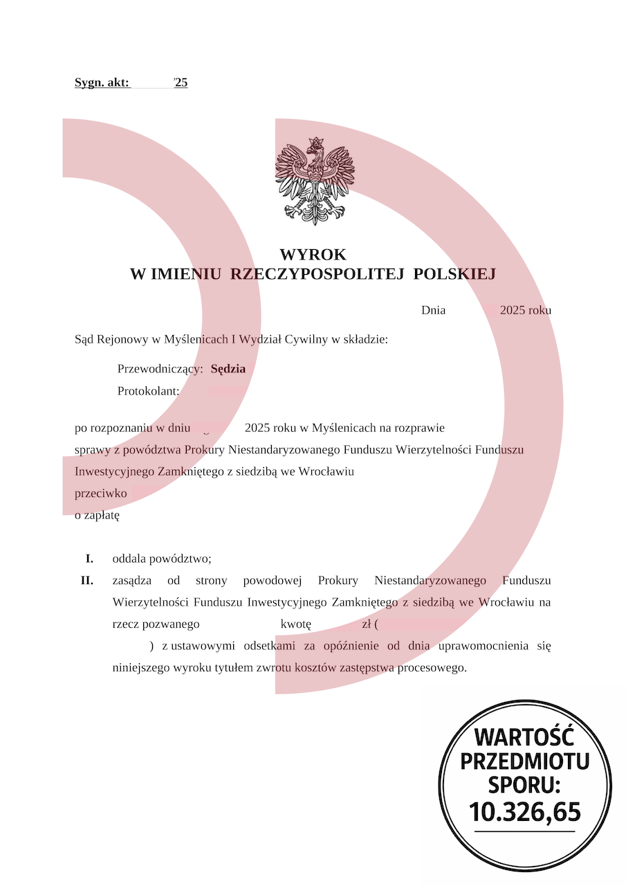 Moment rozprawy był dla klienta stresujący, jednak szybko okazało się, że pożyczka dla zadłużonych to bajka, a fakty działają na jego korzyść. Wierzyciel nie potrafił udowodnić zasadności swoich roszczeń, a argumentacja prawników kancelarii była spójna i rzeczowa. Sąd oddalił powództwo w całości, co całkowicie odmieniło sytuację klienta.