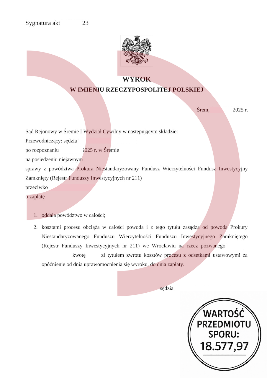 Załączony wyrok z Sądu Rejonowego w Śremie jasno pokazuje, że nawet sprawy o znaczne kwoty nie są z góry przesądzone. Bardzo doświadczony adwokat potrafi wykorzystać błędy funduszu i doprowadzić do korzystnego rozstrzygnięcia, które jeszcze kilka lat temu wielu dłużnikom wydawałoby się niemożliwe.