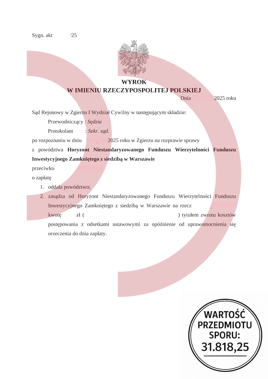 Potwierdzeniem tego jest załączony wyrok Sądu Rejonowego w Zgierzu, gdzie w sprawie z powództwa Horyzont Niestandaryzowanego Funduszu Wierzytelności Funduszu Inwestycyjnego Zamkniętego sąd oddalił powództwo w całości. Sprawa dotyczyła zapłaty kwoty 31.818,25 zł. Co więcej, sąd zasądził na rzecz pozwanego zwrot kosztów postępowania. Ten wyrok jasno pokazuje, że nawet zobowiązania wynikające z pożyczek online nie są automatycznie „nie do ruszenia”.