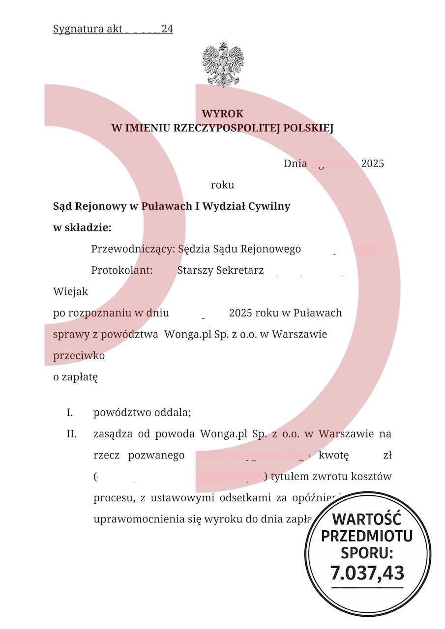 Dobrym potwierdzeniem skuteczności, jaką daje wyspecjalizowany prawnik i antywindykacja, jest załączony wyrok Sądu Rejonowego w Puławach. W sprawie z powództwa Wonga.pl sp. z o.o. sąd oddalił powództwo w całości, mimo że wartość przedmiotu sporu wynosiła 7.037,43 zł. Dodatkowo zasądzono na rzecz pozwanego zwrot kosztów procesu. Ten wyrok pokazuje, że nawet sprawy prowadzone przez znane firmy pożyczkowe mogą zakończyć się pełną wygraną dłużnika.