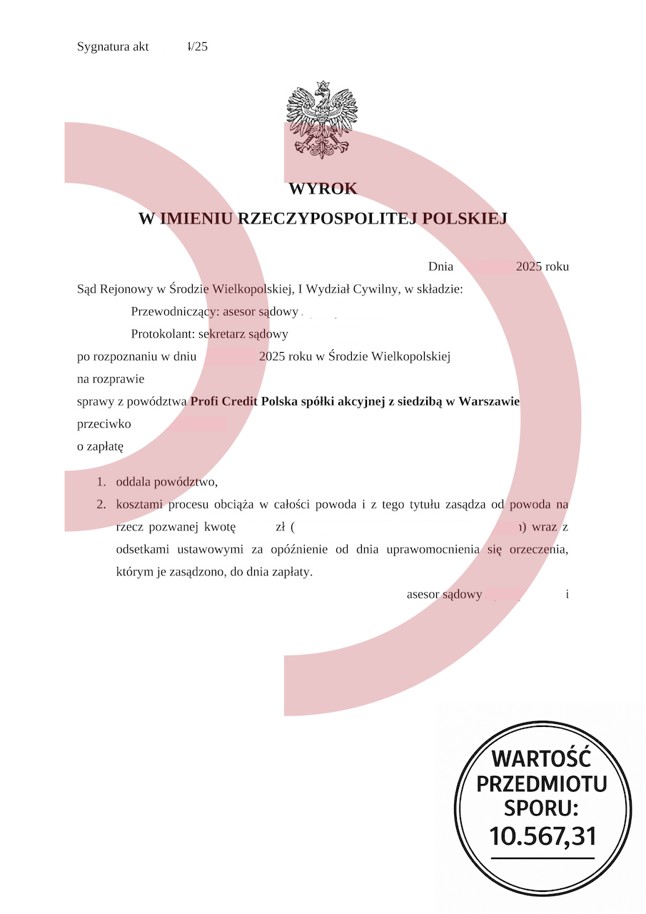 Uzyskany efekt: Powództwo oddalone w całości, brak odsetek, brak kosztów procesu.