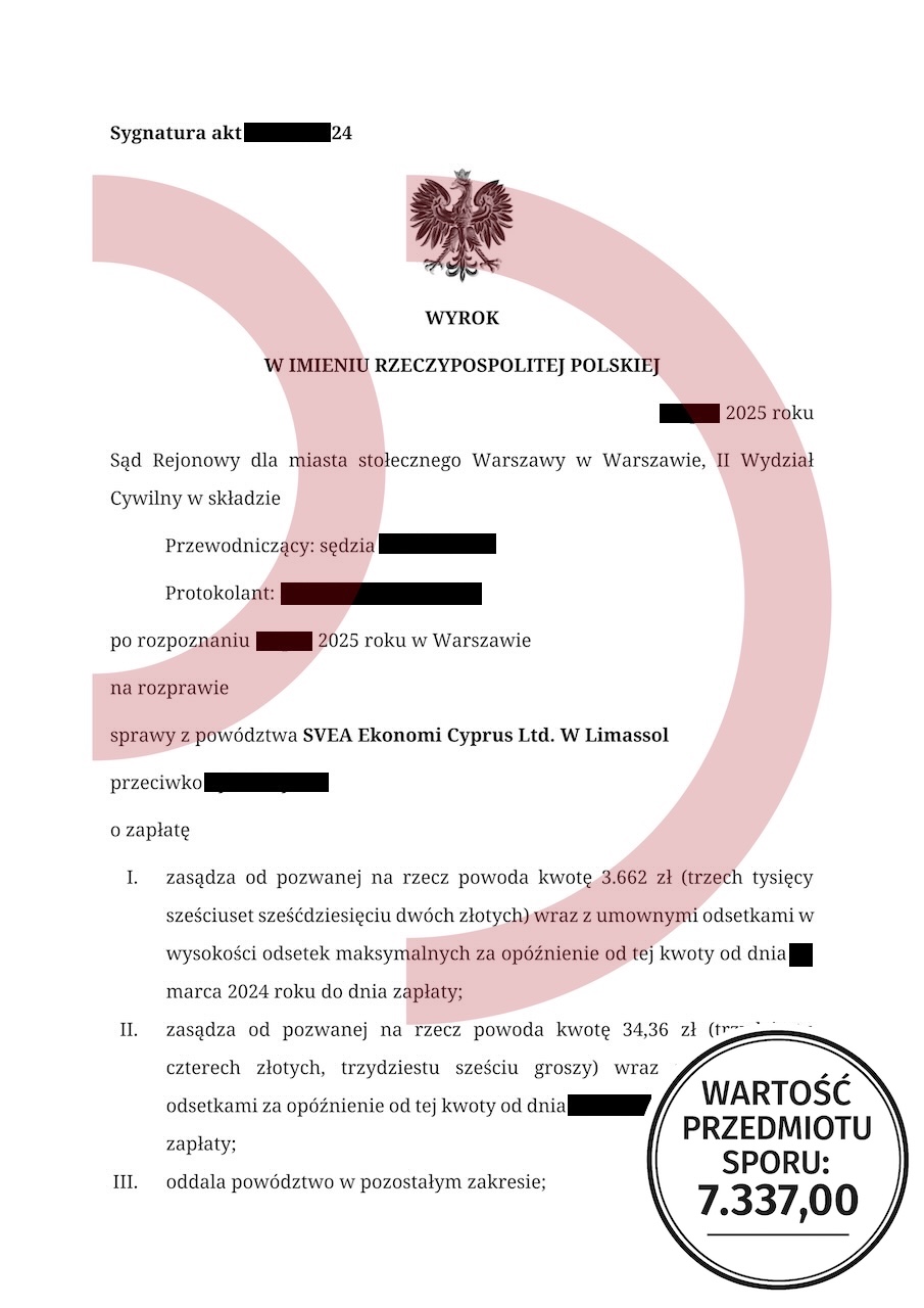 Po kilku miesiącach odbyła się rozprawa. Nasi prawnicy szczegółowo przedstawili wszystkie dowody, wykazali niezgodne z prawem praktyki i podważali kolejne argumenty wierzyciela. Wreszcie zapadł wyrok: sąd oddalił powództwo wierzyciela w części. Pani Natalia nie musiała spłacać kilku tysięcy złotych, których w rzeczywistości nigdy nie była winna. Jej dług zmniejszył się do poziomu możliwego do uregulowania. Po rozprawie powiedziała: po raz pierwszy od lat czuję, że mogę oddychać. Dlaczego częściowe zwycięstwo to też ogromna wygrana?  Dla wielu osób częściowe oddalenie roszczeń może brzmieć jak półśrodek. Ale dla naszych klientów to często punkt zwrotny. Zmniejszenie długu z nieosiągalnego poziomu do realnej kwoty pozwala odzyskać równowagę i planować przyszłość bez strachu. W przypadku pani Natalii oznaczało to koniec telefonów od windykatorów, koniec lęku przed komornikiem i koniec życia w ciągłym napięciu.