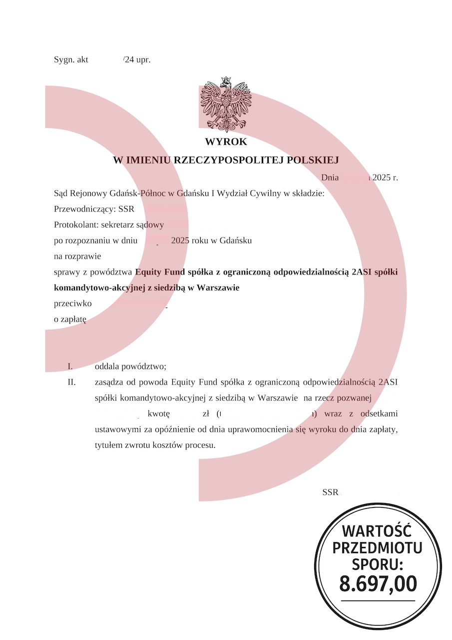 Uzyskany efekt: Powództwo oddalone w całości, brak odsetek, brak kosztów procesu.