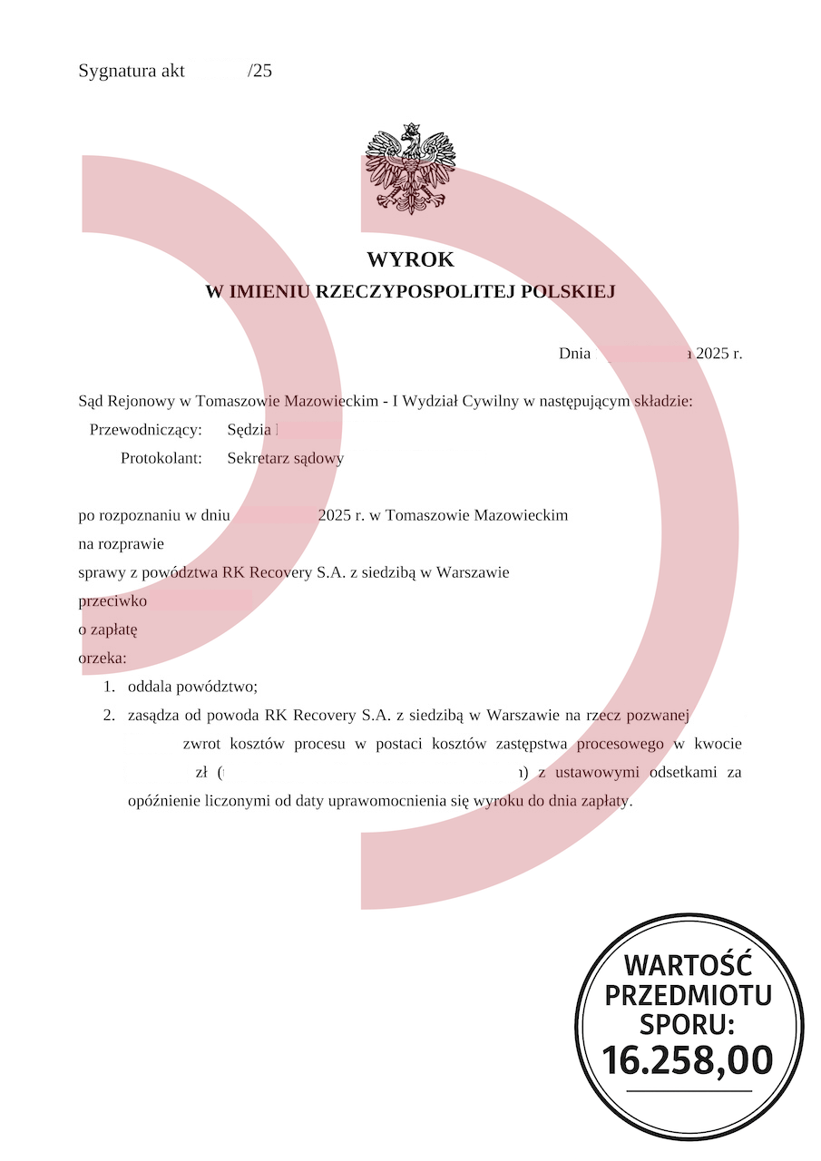 Uzyskany efekt: Powództwo oddalone w całości, brak odsetek, brak kosztów procesu