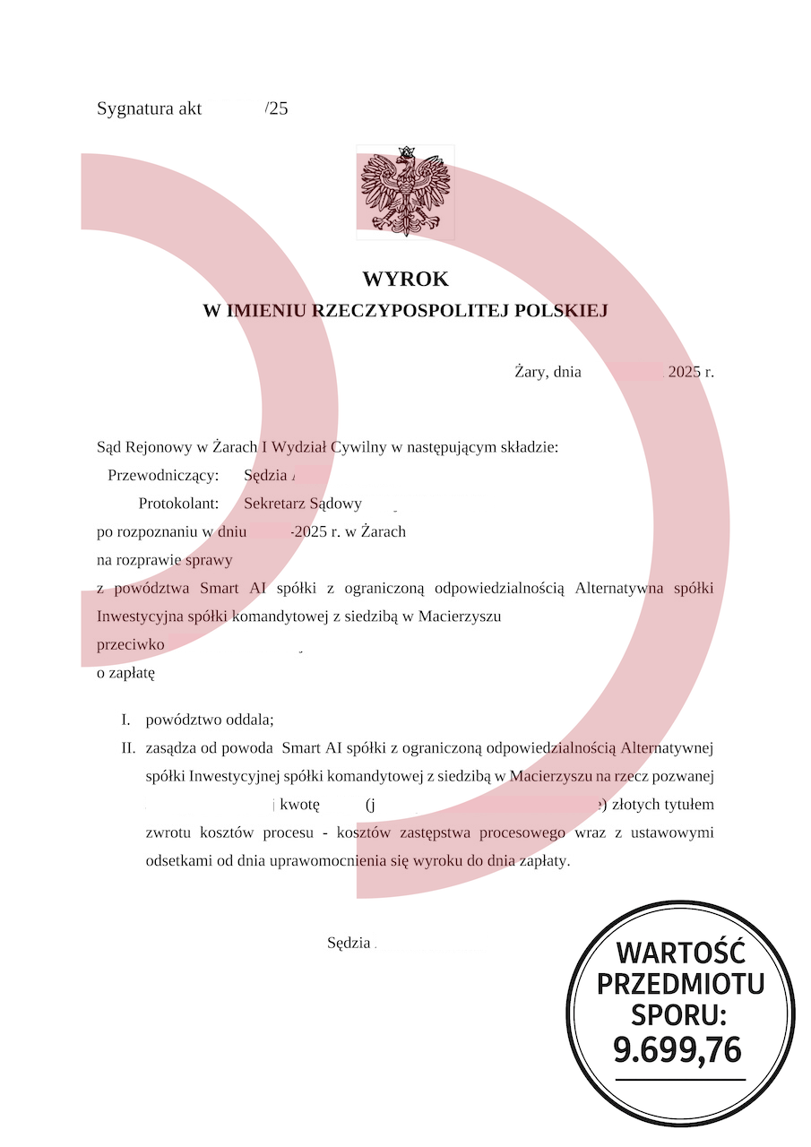Uzyskany efekt: Powództwo oddalone w całości, brak odsetek, brak kosztów procesu