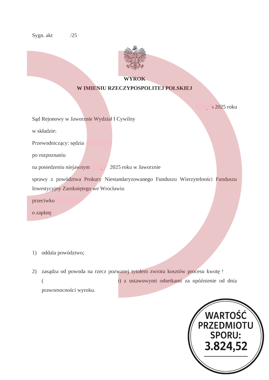 Uzyskany efekt: Powództwo oddalone w całości, brak odsetek, brak kosztów procesu.