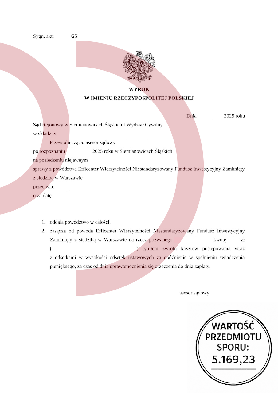 Potwierdzeniem tego, jak ważna jest fachowa pomoc, jest załączony wyrok Sądu Rejonowego w Siemianowicach Śląskich. Sprawa dotyczyła powództwa wniesionego przez Efficenter Wierzytelności Niestandaryzowany Fundusz Inwestycyjny Zamknięty z siedzibą w Warszawie. Wartość przedmiotu sporu wynosiła 5.169,23 zł.