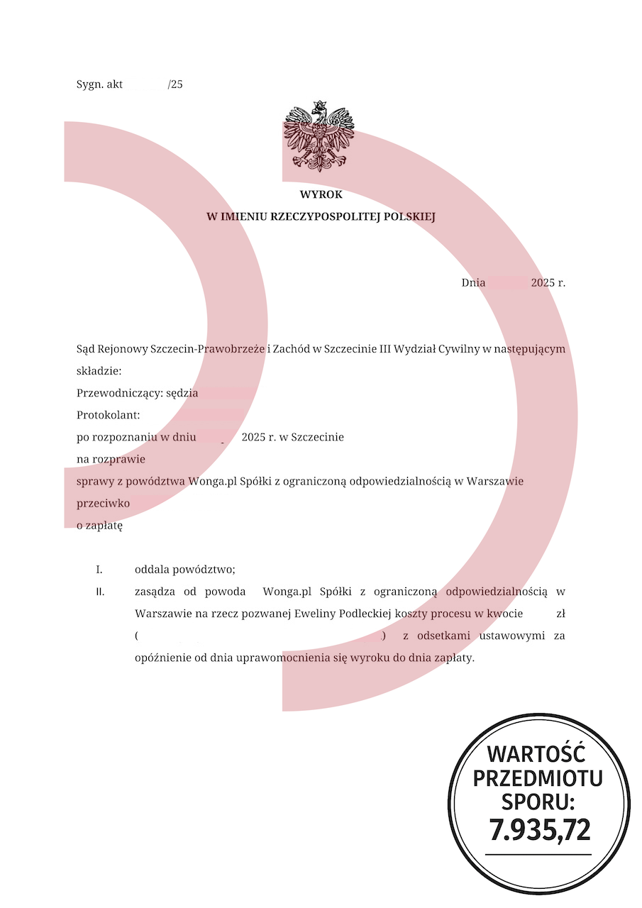 Powództwo oddalone w całości, brak odsetek, brak kosztów procesu.