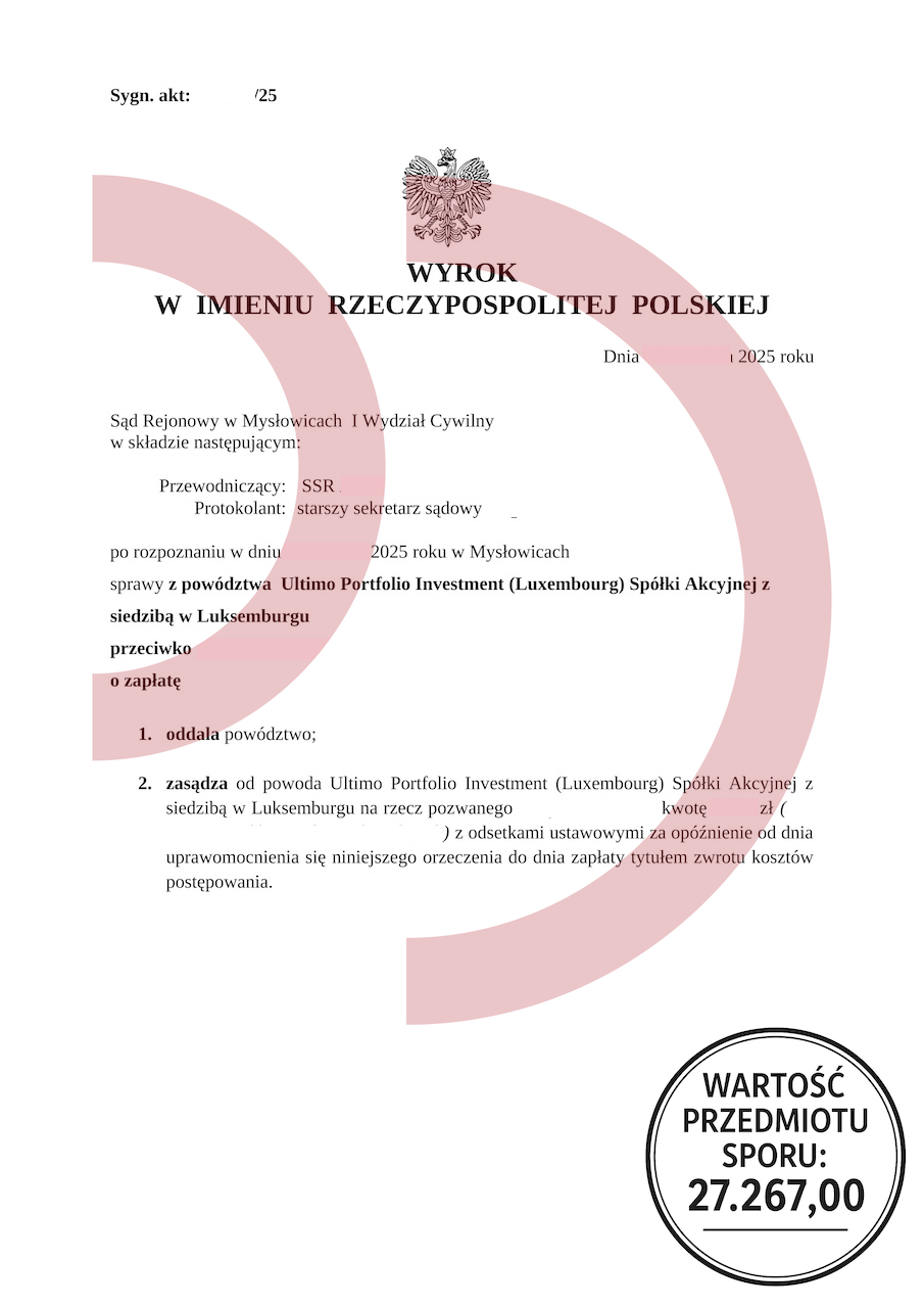 Uzyskany efekt: Powództwo oddalone w całości, brak odsetek, brak kosztów procesu.