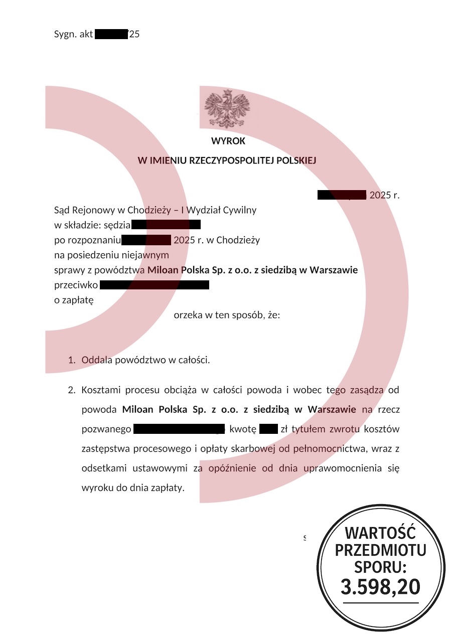 Uzyskany efekt: Powództwo oddalone w całości, brak odsetek, brak kosztów procesu
