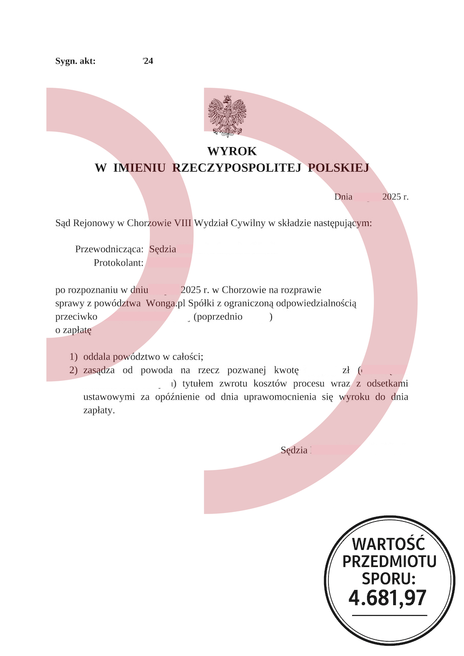Uzyskany efekt: Powództwo oddalone w całości, brak odsetek, brak kosztów procesu