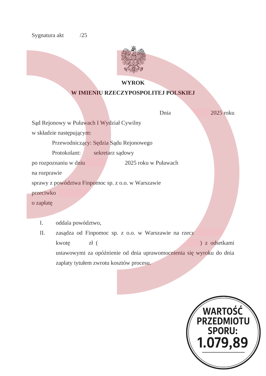 Tak właśnie stało się w sprawie rozpatrzonej przez Sąd Rejonowy w Puławach, gdzie Finpomoc sp. z o.o. przegrała proces o zapłatę. Sąd uznał roszczenie za nieudowodnione i oddalił powództwo w całości. To jasny sygnał, że warto walczyć i sprawdzać, czy pożyczkodawca naprawdę ma prawo żądać zapłaty.