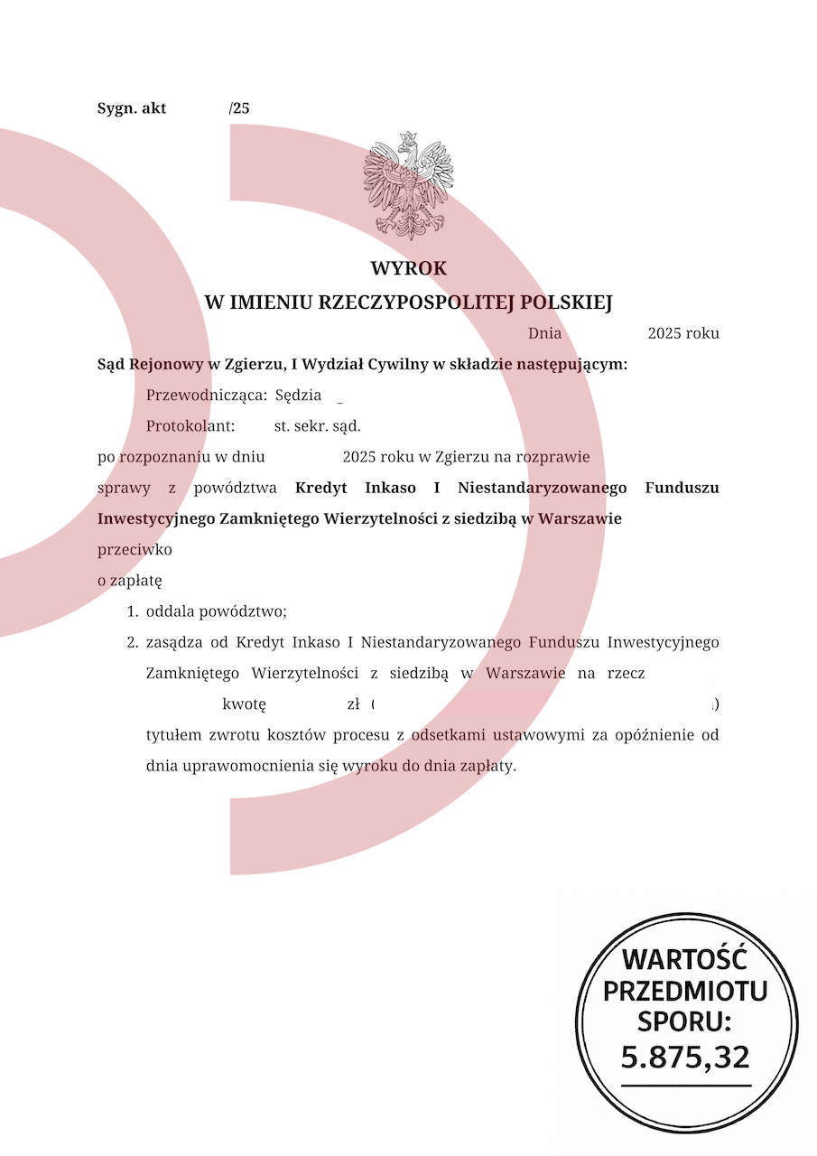Załączony wyrok Sądu Rejonowego w Zgierzu pokazuje, że nawet jeśli źródłem problemów była kłopotliwa pożyczka bez sprawdzania zdolności kredytowej, nie oznacza to automatycznej porażki w sądzie. Sprawa dotyczyła powództwa wniesionego przez Kredyt Inkaso I Niestandaryzowany Fundusz Inwestycyjny Zamknięty z siedzibą w Warszawie. Wartość przedmiotu sporu wynosiła 5.875,32 zł.