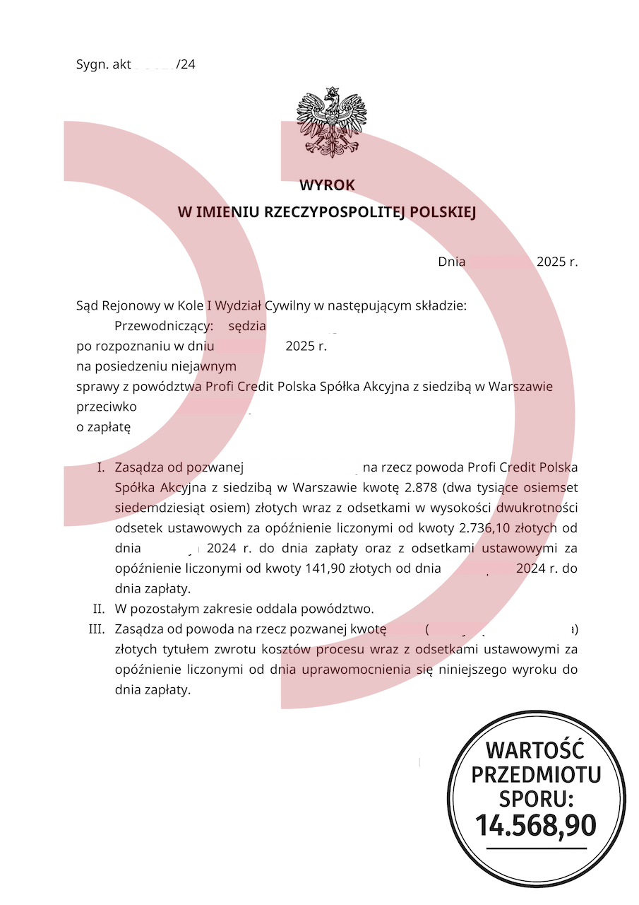 Nasi prawnicy od razu zauważyli, że część opłat w umowie była rażąco wygórowana. Przygotowaliśmy więc odpowiedź na pozew, w której wykazaliśmy, że pobrane przez Profi Credit koszty nie miały prawa się wydarzyć. Wskazaliśmy, że opłaty administracyjne i prowizje były nieproporcjonalne do kwoty udzielonej pożyczki, a przez to niezgodne z ustawą o kredycie konsumenckim. Sąd dokładnie przeanalizował przedstawione dowody. W efekcie uznał, że konsolidacja chwilówek w Profi Credit była obciążona nieuczciwymi kosztami. Co więcej, stwierdził, że suma rat już wpłaconych przez naszego klienta całkowicie wystarcza na zamknięcie zobowiązania. Powództwo zostało oddalone w całości. Dla naszego klienta oznaczało to nie tylko koniec stresu, ale też poczucie zwycięstwa. Dzięki wygranej sprawie mógł skupić się na dalszym planie oddłużania i spokojnie kontynuować swoją drogę do wyjścia z długów.