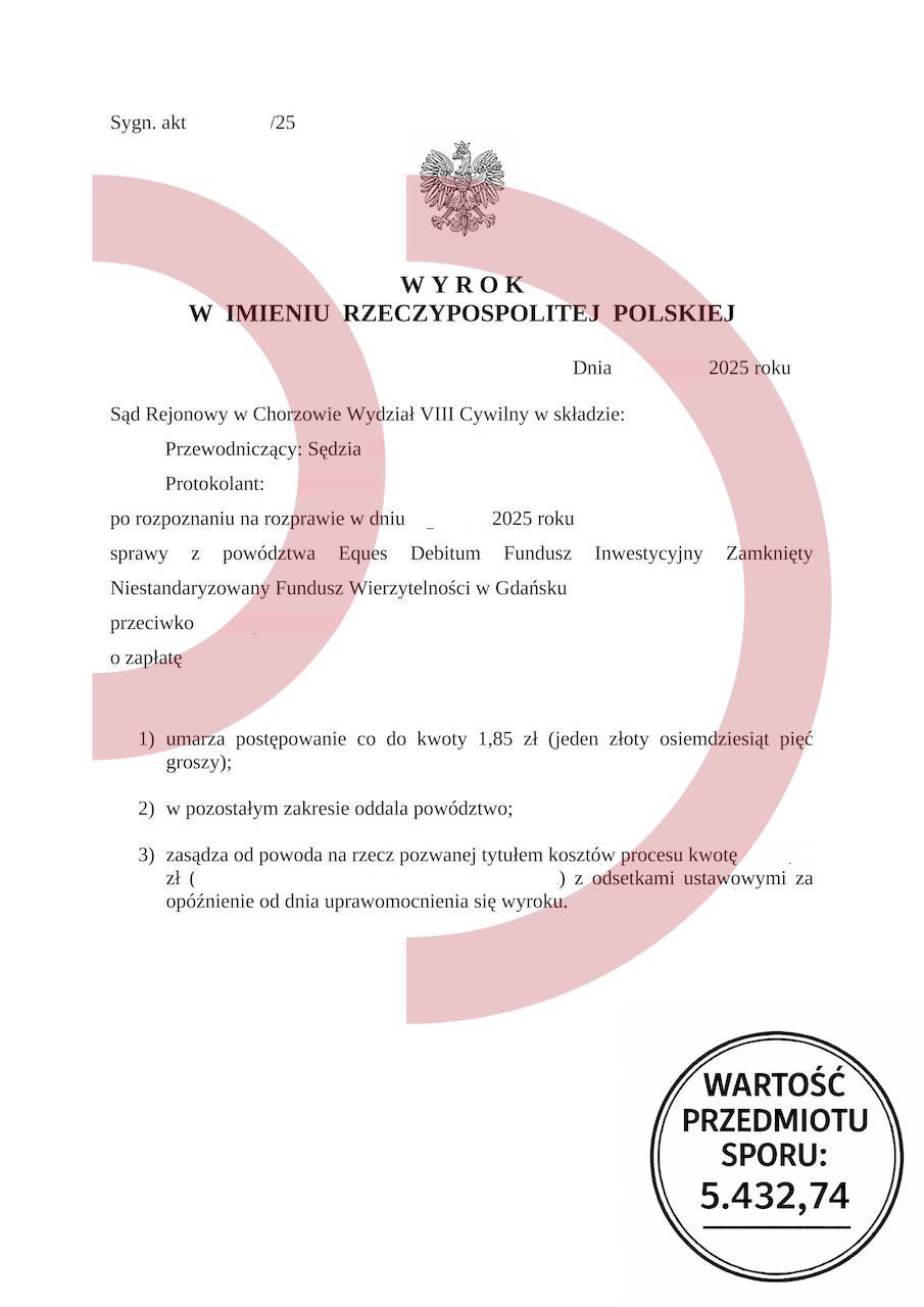 Dobrym przykładem jest załączony wyrok Sądu Rejonowego w Chorzowie. W sprawie z powództwa Eques Debitum Funduszu Inwestycyjnego Zamkniętego sąd w niewielkim zakresie umorzył postępowanie, a w pozostałej części oddalił powództwo. Wartość przedmiotu sporu wynosiła 5.432,74 zł, a dodatkowo zasądzono na rzecz pozwanej zwrot kosztów procesu. Ten wyrok pokazuje, że nawet jeśli lekkomyślne spłacanie długu długiem doprowadziło do sprawy sądowej, dłużnik nadal ma realne szanse na obronę.