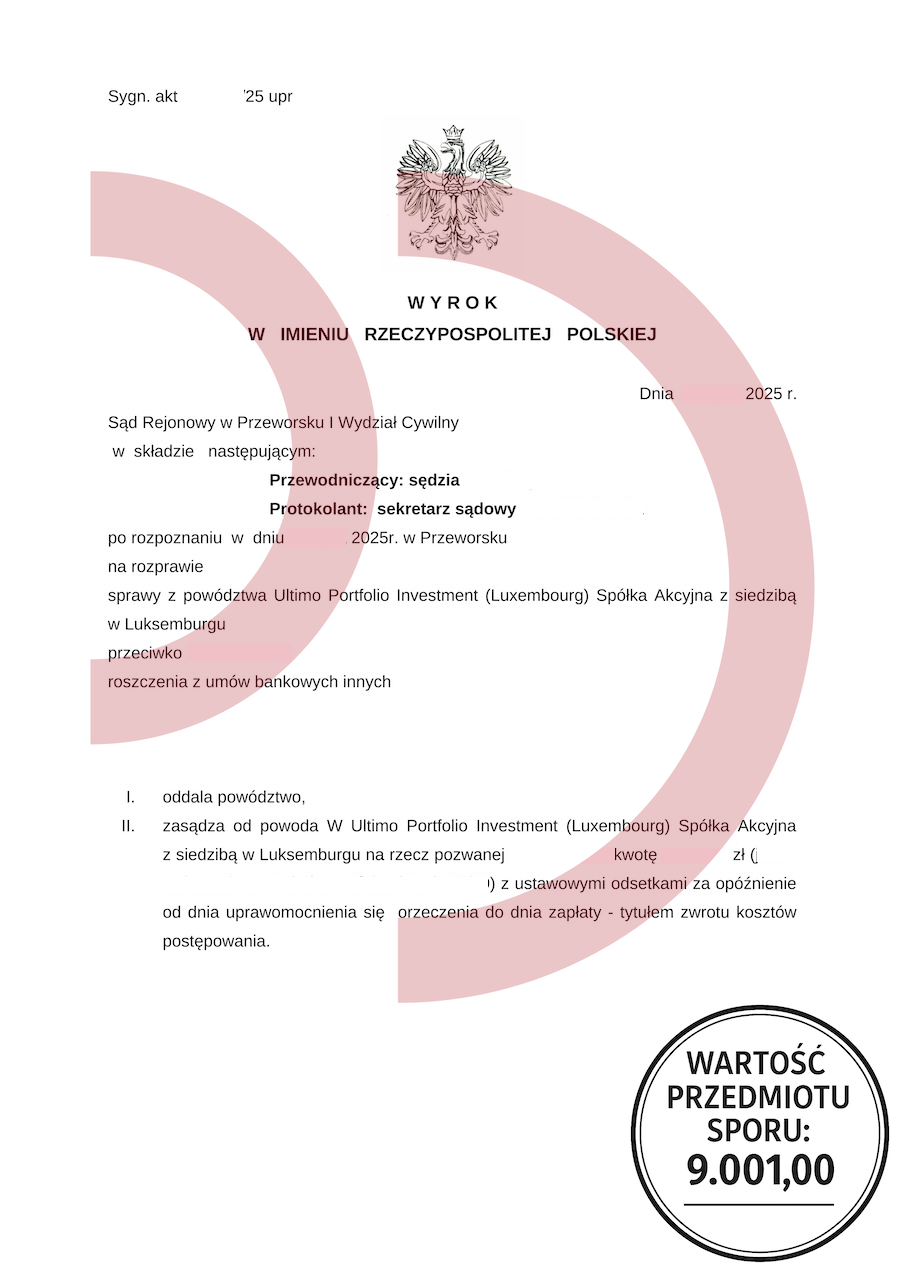 Uzyskany efekt: Powództwo oddalone w całości, brak odsetek, brak kosztów procesu.