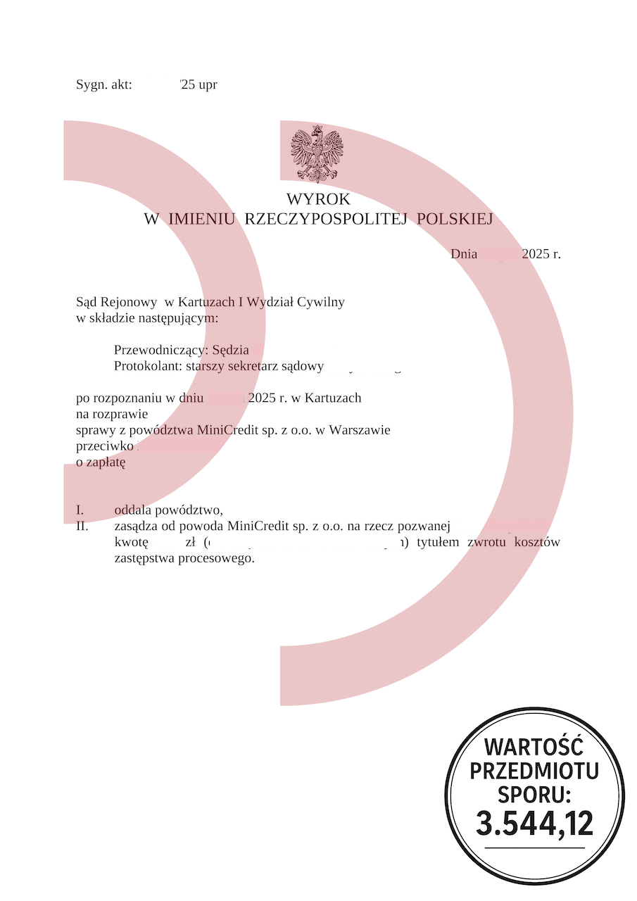 Uzyskany efekt: Powództwo oddalone w całości, brak odsetek, brak kosztów procesu