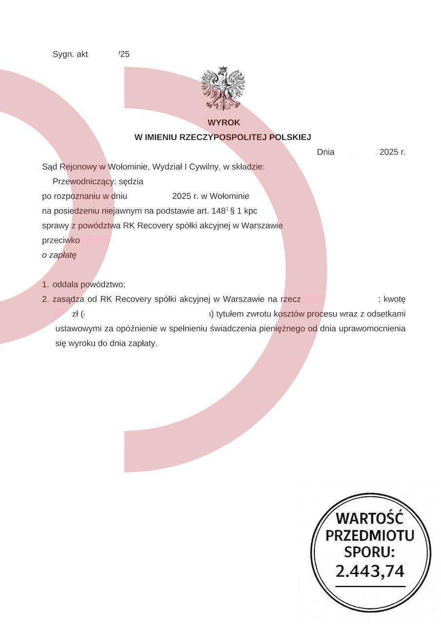 Dobrym przykładem tego, że nieprzemyślana konsolidacja długów nie zawsze jest najlepszym rozwiązaniem, jest załączony wyrok Sądu Rejonowego w Wołominie. Sprawa dotyczyła powództwa wniesionego przez RK Recovery S.A. w Warszawie, gdzie wartość przedmiotu sporu wynosiła 2.443,74 zł.