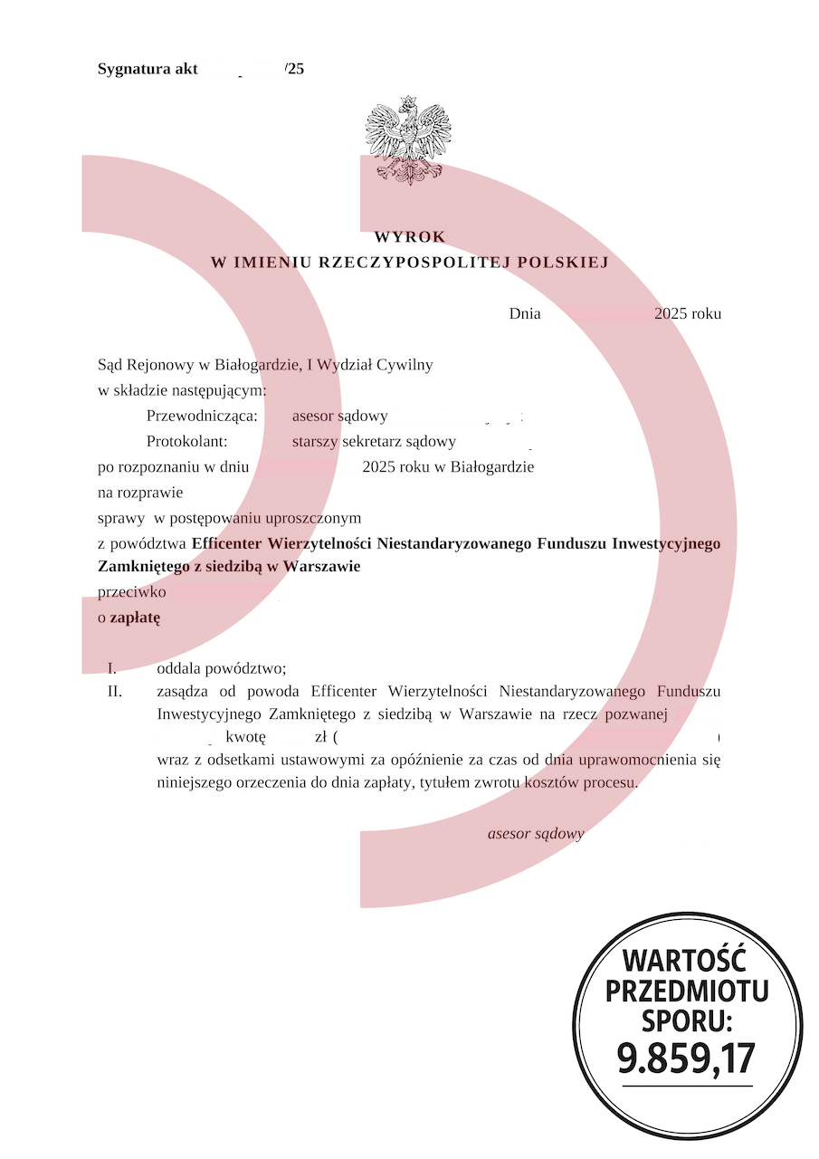 Sprawa z powództwa Efficenter o 9.859,17 zł zakończyła się pełnym sukcesem dłużniczki – sąd oddalił powództwo w całości, a fundusz musi zwrócić jej koszty procesu. To kolejny dowód, że pomoc w oddłużaniu pożyczek w parabankach naprawdę działa.
