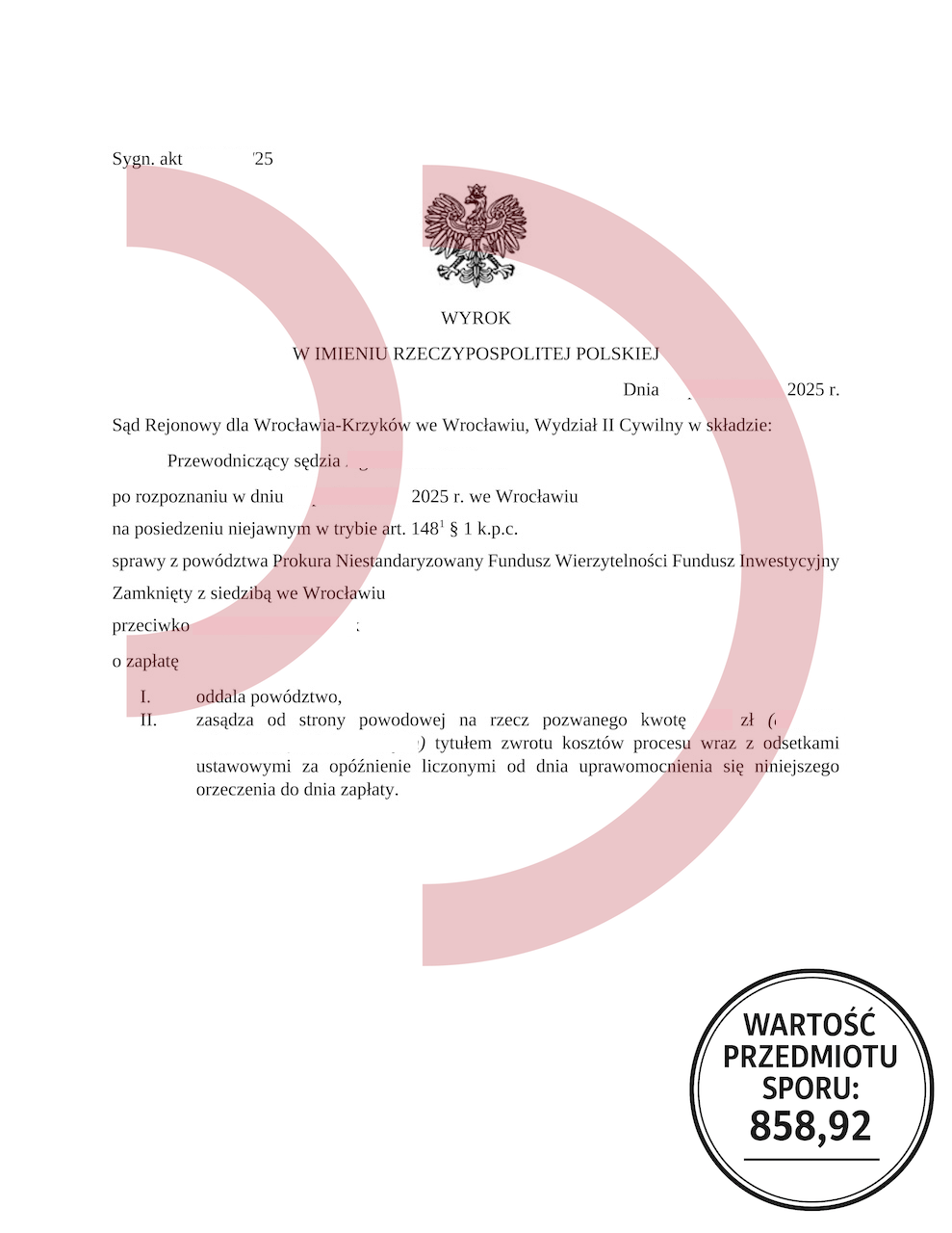 Uzyskany efekt: Powództwo oddalone w całości, brak odsetek, brak kosztów procesu.