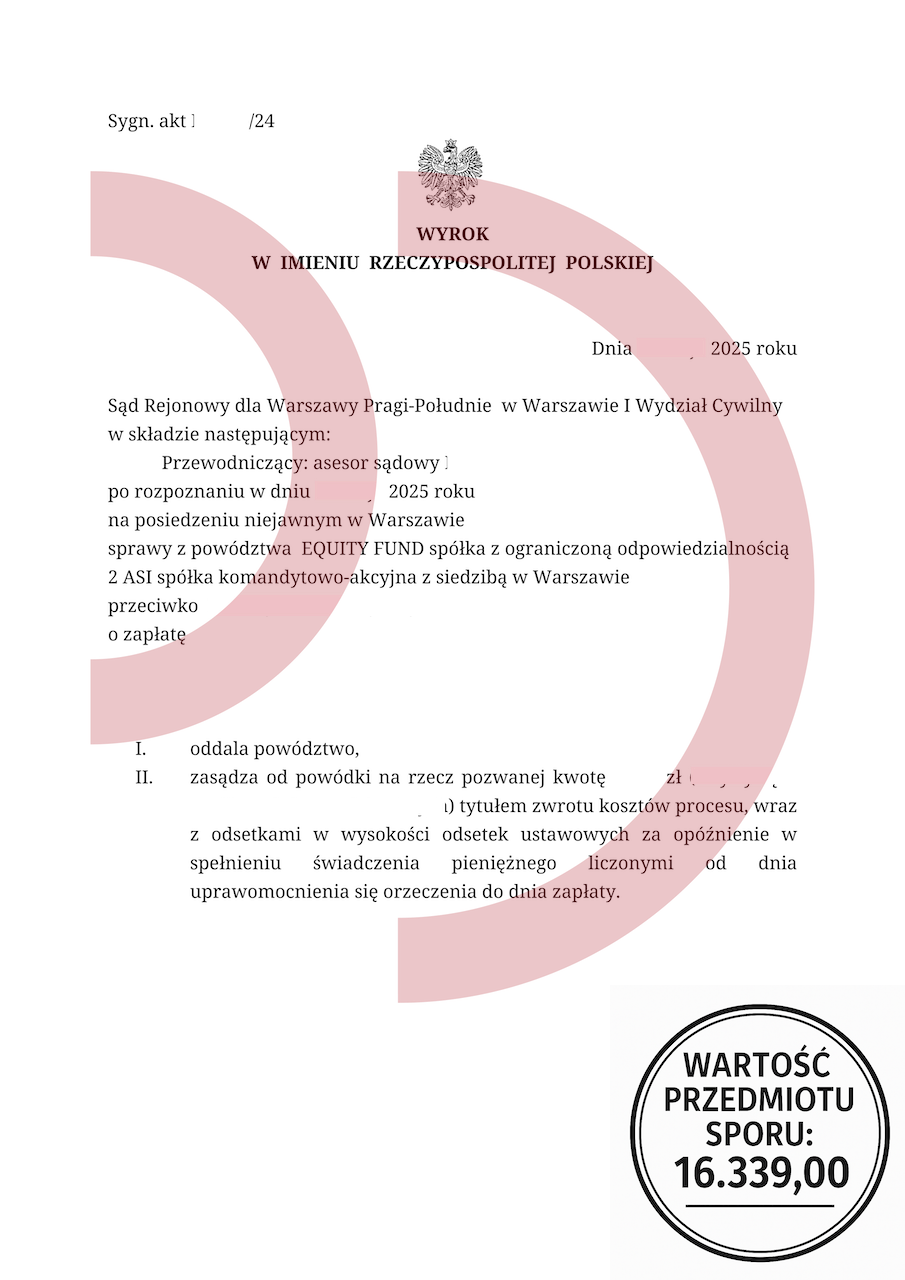 Uzyskany efekt: Powództwo oddalone w całości, brak odsetek, brak kosztów procesu