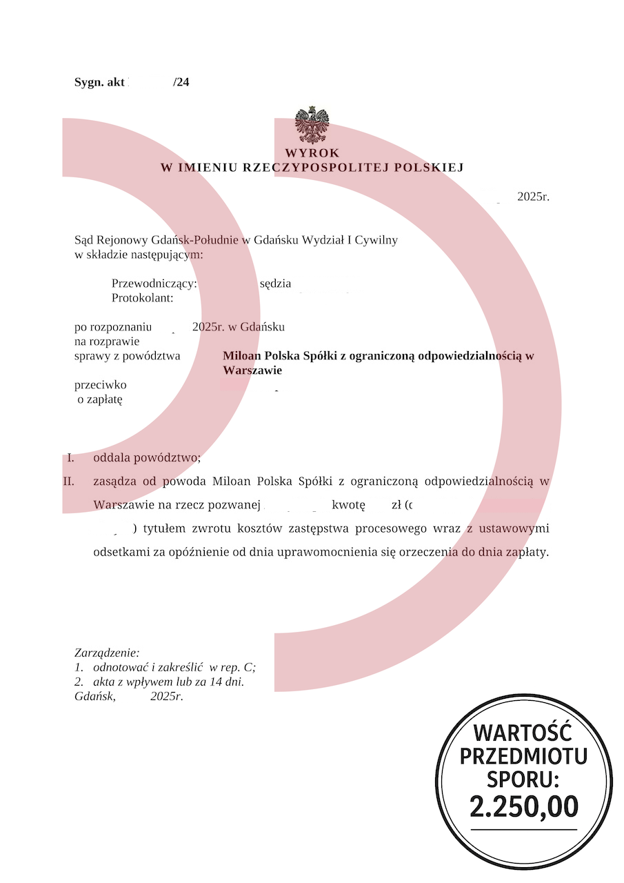 Uzyskany efekt: Powództwo oddalone w całości, brak odsetek, brak kosztów procesu