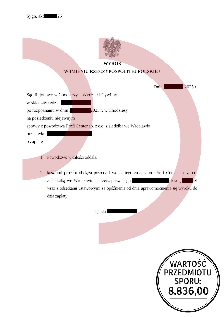 Uzyskany efekt: Powództwo oddalone w całości, brak odsetek, brak kosztów procesu