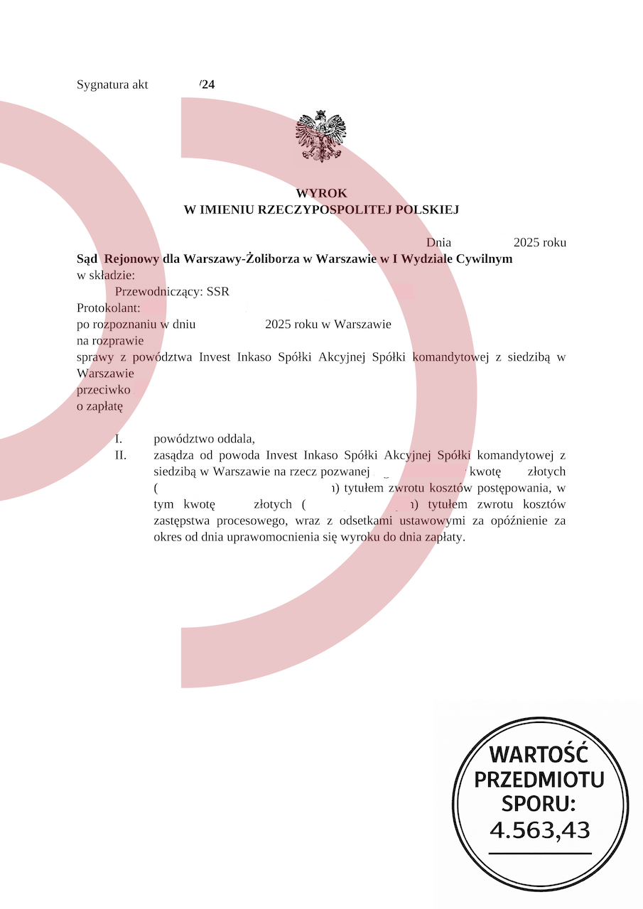 Załączony wyrok Sądu Rejonowego dla Warszawy-Żoliborza w Warszawie pokazuje, że profesjonalna i skuteczna pomoc dłużnikom działa także w praktyce. Sprawa dotyczyła powództwa wniesionego przez Invest Inkaso Spółkę Akcyjną Spółkę komandytową z siedzibą w Warszawie. Wartość przedmiotu sporu wynosiła 4.563,43 zł.