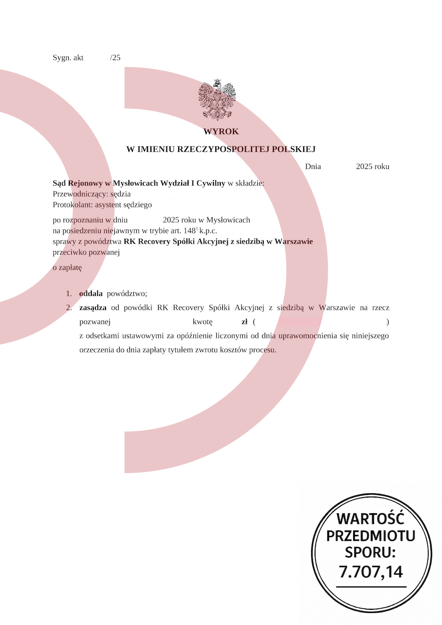 Dobrym potwierdzeniem tego, jak działa profesjonalne umorzenie postępowania windykacyjnego w praktyce, jest załączony wyrok Sądu Rejonowego w Mysłowicach. Sprawa dotyczyła powództwa wniesionego przez RK Recovery S.A. z siedzibą w Warszawie, a wartość przedmiotu sporu wynosiła 7.707,14 zł.