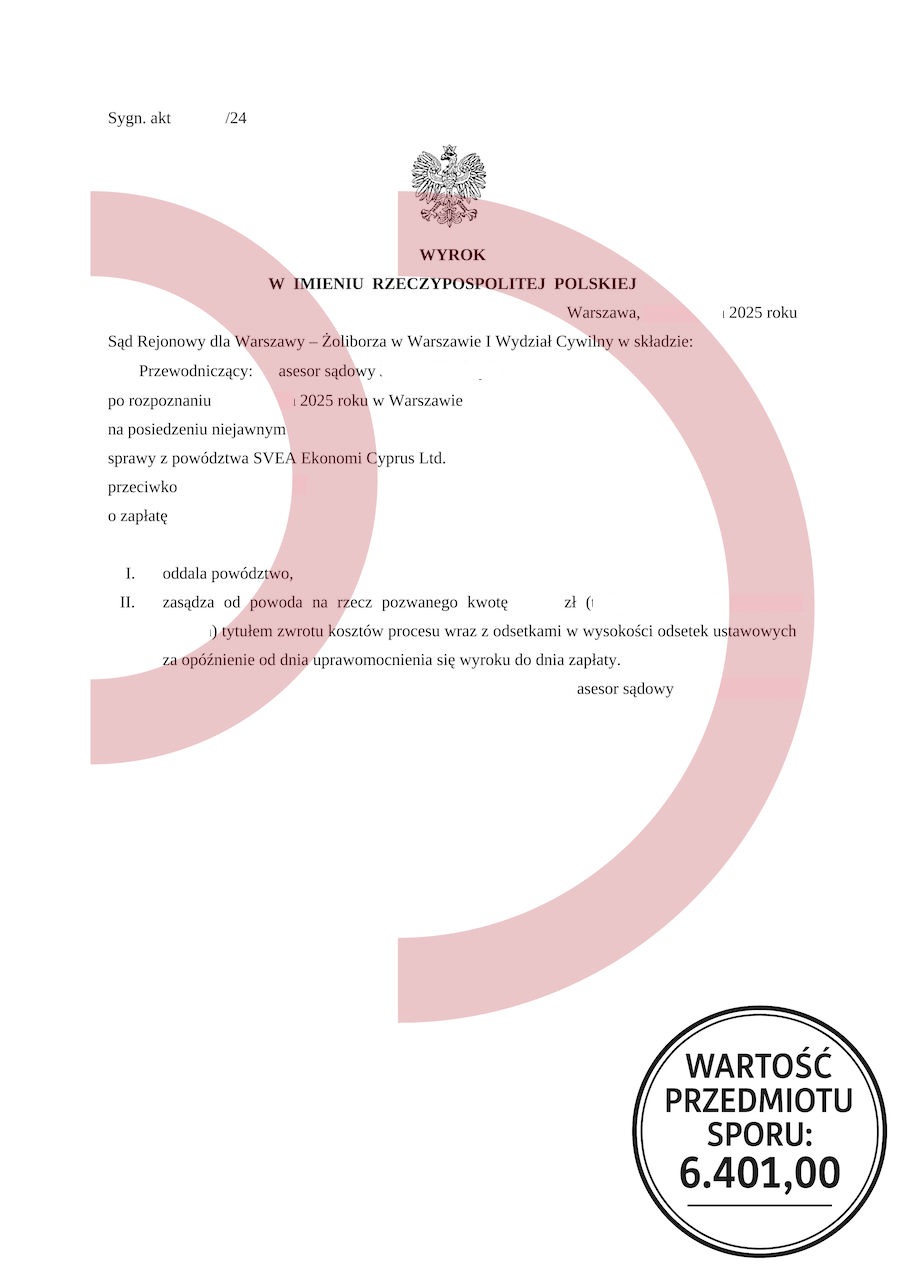 Uzyskany efekt: Powództwo oddalone w całości, brak odsetek, brak kosztów procesu